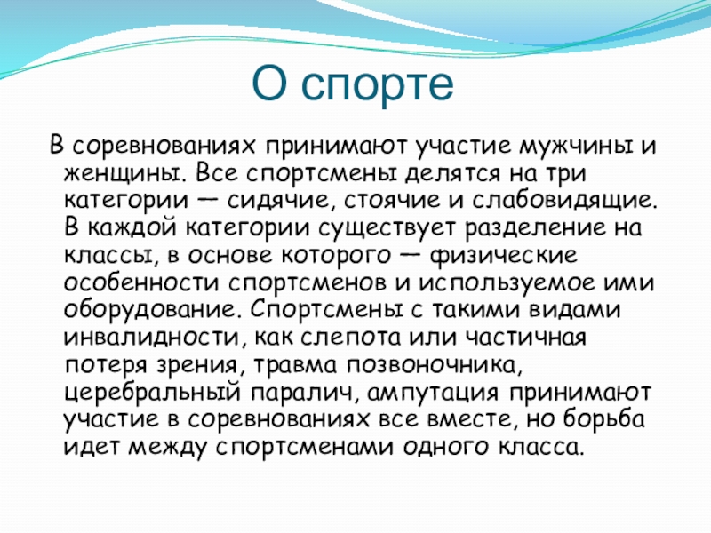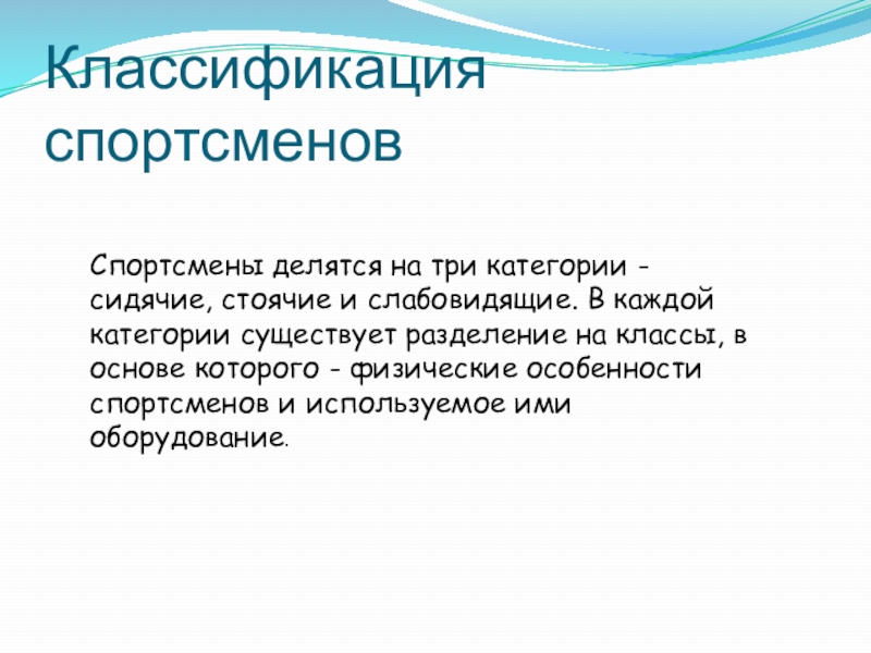 Слайд 14Спортсмены делятся на три категории - сидячие, стоячие и слабовидящие. В