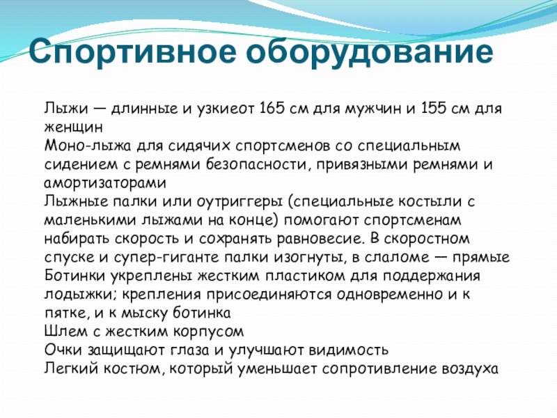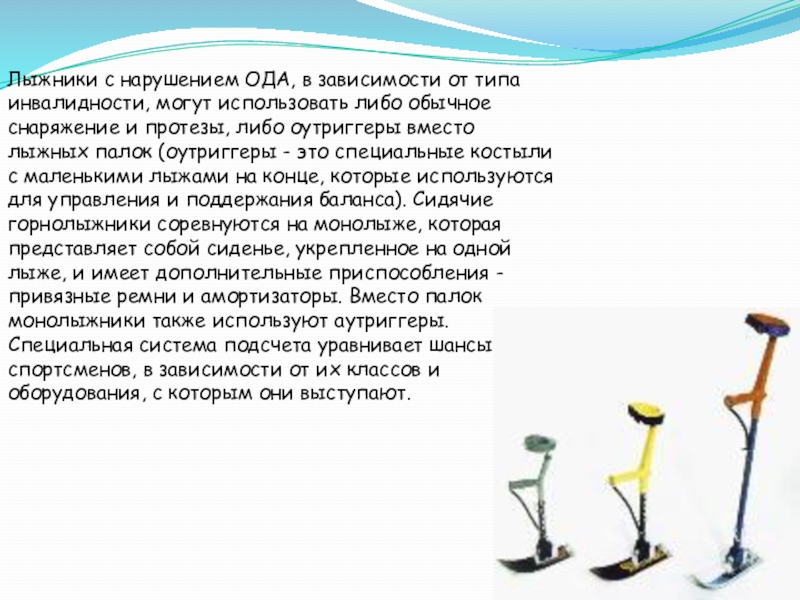 Слайд 13Лыжники с нарушением ОДА, в зависимости от типа инвалидности, могут использовать