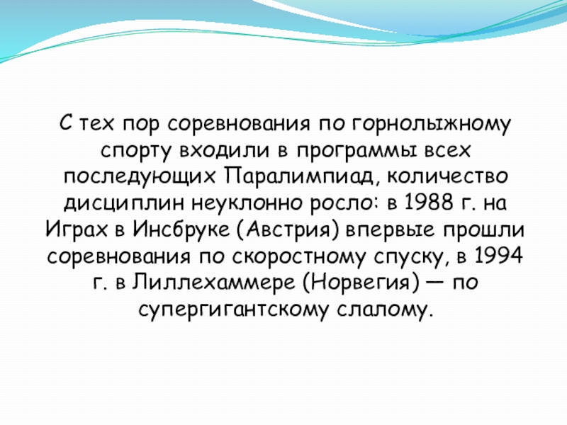 всех последующих Паралимпиад, количество дисциплин неуклонно росло: в 1988 г. на Играх в Инсбруке (Австрия) впервые прошли соревнования по скоростному спуску, в 1994 г. в Лиллехаммере (Норвегия) — по супергигантскому слалому.