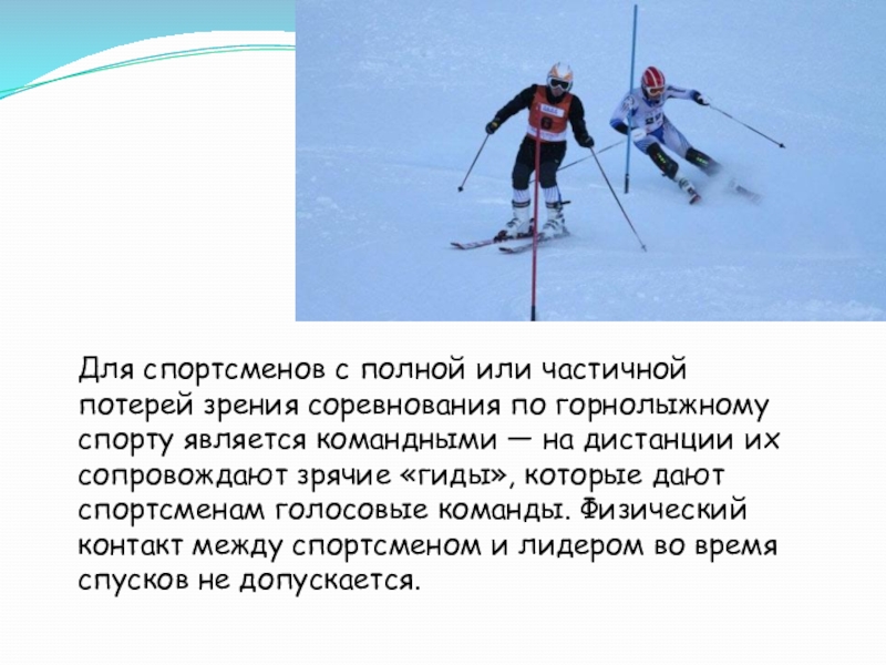 спорту является командными — на дистанции их сопровождают зрячие «гиды», которые дают спортсменам голосовые команды. Физический контакт между спортсменом и лидером во время спусков не допускается.
