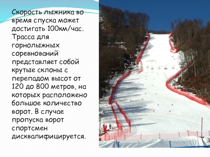 Слайд 12Скорость лыжника во время спуска может достигать 100км/час. Трасса для горнолыжных