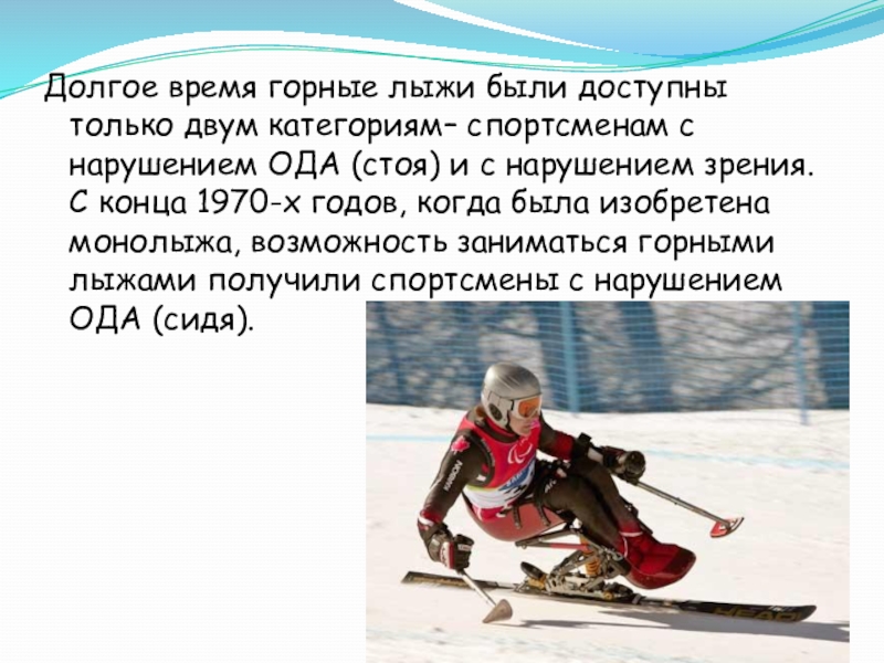нарушением ОДА (стоя) и с нарушением зрения. С конца 1970-х годов, когда была изобретена монолыжа, возможность заниматься горными лыжами получили спортсмены с нарушением ОДА (сидя).
