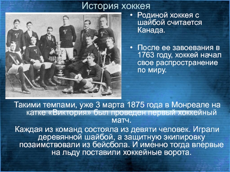 Такими темпами, уже 3 марта 1875 года в Монреале на катке «Виктория» был проведен первый хоккейный матч.
