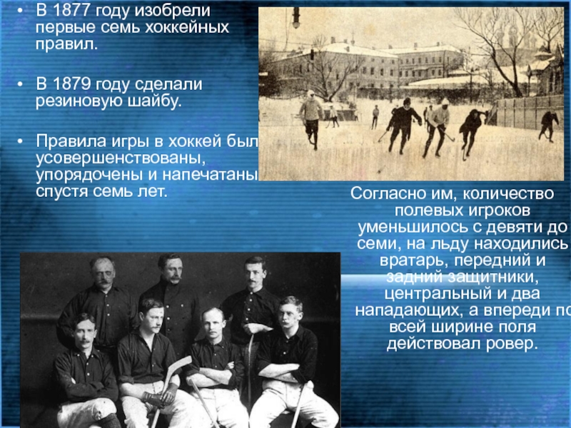 Каждая из команд состояла из девяти человек. Играли деревянной шайбой, а защитную экипировку позаимствовали из бейсбола. И именно тогда впервые на льду поставили хоккейные ворота.