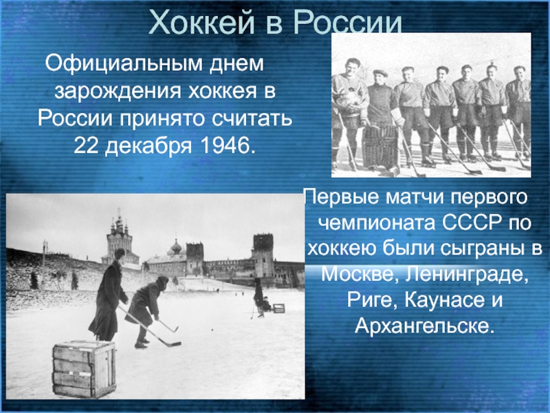 Первые матчи первого чемпионата СССР по хоккею были сыграны в Москве, Ленинграде, Риге, Каунасе и Архангельске.