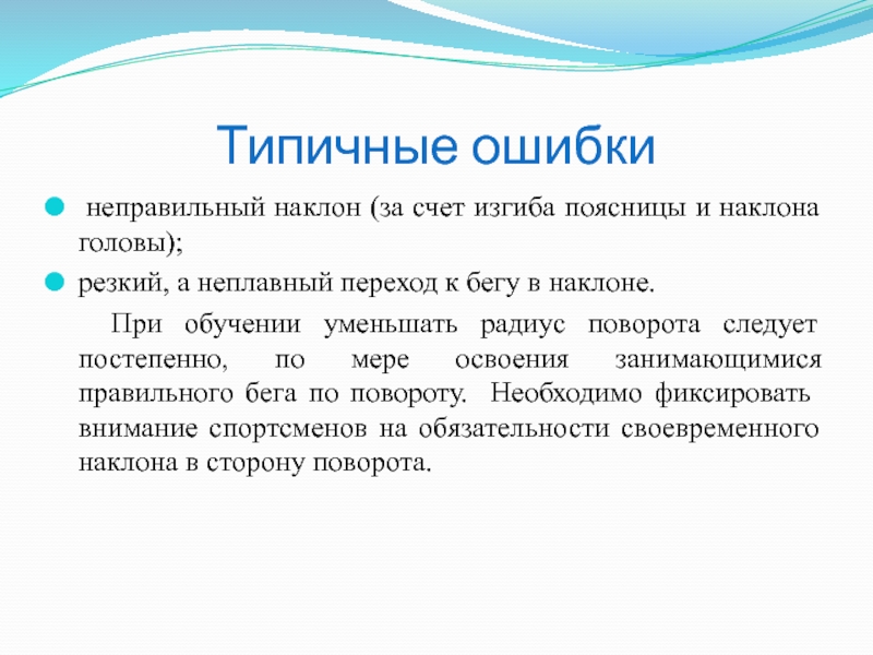 При обучении уменьшать радиус поворота следует постепенно, по мере освоения занимающимися правильного бега по повороту. Необходимо фиксировать внимание спортсменов на обязательности своевременного наклона в сторону поворота.