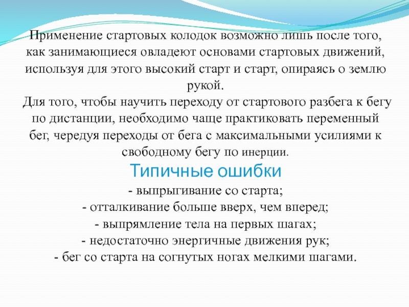 Слайд 12Применение стартовых колодок возможно лишь после того, как занимающиеся овладеют основами