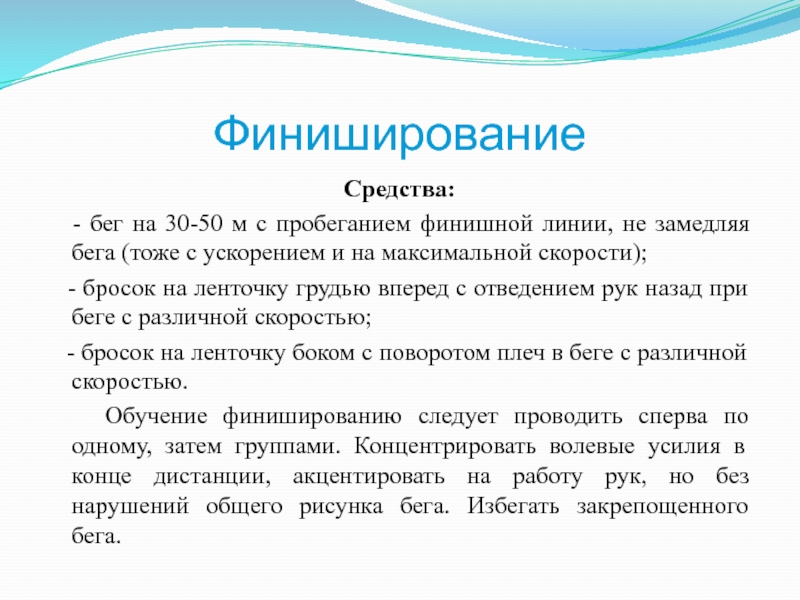 Обучение финишированию следует проводить сперва по одному, затем группами. Концентрировать волевые усилия в конце дистанции, акцентировать на работу рук, но без нарушений общего рисунка бега. Избегать закрепощенного бега.
