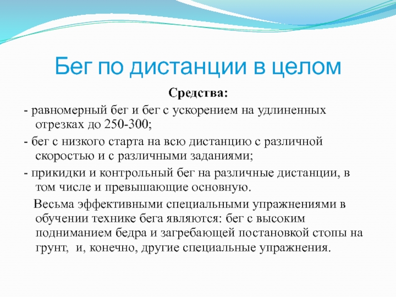 Весьма эффективными специальными упражнениями в обучении технике бега являются: бег с высоким подниманием бедра и загребающей постановкой стопы на грунт, и, конечно, другие специальные упражнения.
