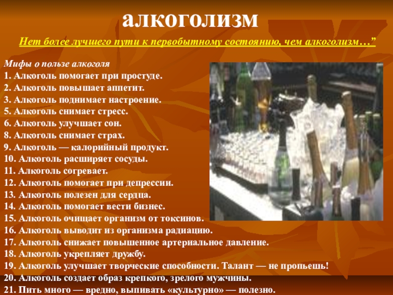 Нет более лучшего пути к первобытному состоянию, чем алкоголизм…”