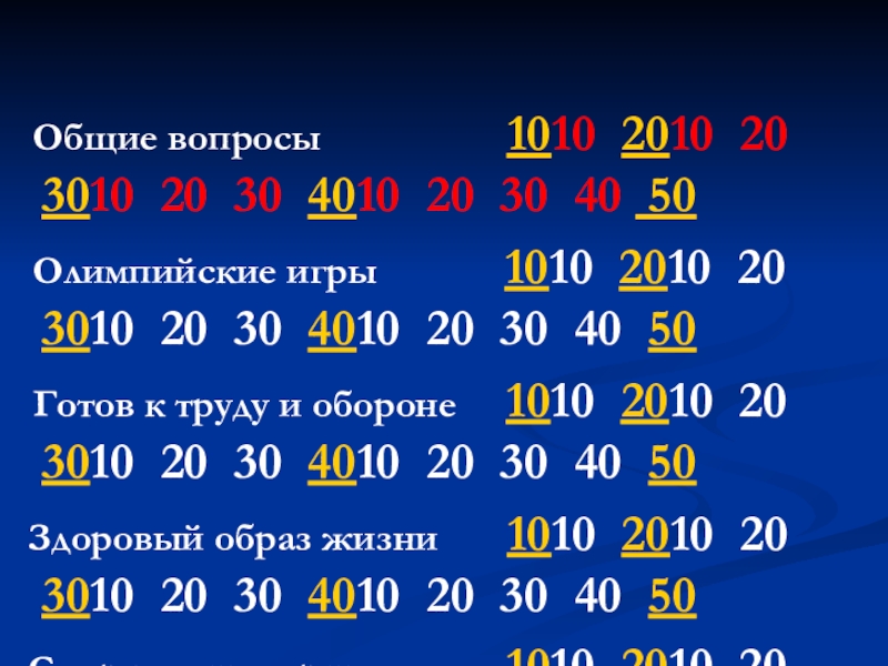 Спортивные игры 1010 2010 20 3010 20 30 4010 20 30 40 50