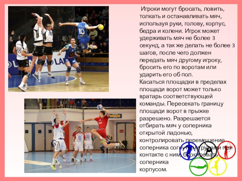 Слайд 8 Игроки могут бросать, ловить, толкать и останавливать мяч, используя руки, голову,