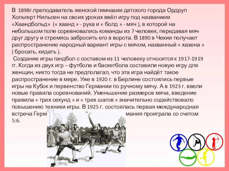 уроках ввёл игру под названием «Хаандбольд» (« хаанд » - рука и « болд » - мяч ), в которой на небольшом поле соревновались команды из 7 человек, передавая мяч друг другу и стремясь забросить его в ворота. В 1890 в Чехии получает распространение народный вариант игры с мячом, названный « хазена » ( бросать, кидать ).