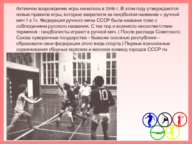 новые правила игры, которые закрепили за гандболом название « ручной мяч 7 х 7». Федерация ручного мяча СССР была названа тоже с соблюдением русского названия. С тех пор и возникло несоответствие терминов : гандболисты играют в ручной мяч. ( После распада Советского Союза суверенные государства – бывшие союзные республики – образовали свои федерации этого вида спорта.) Первые всесоюзные соревнования сборных мужских и женских команд городов СССР по ручному мячу 11 х 11 состоялись в Риге.