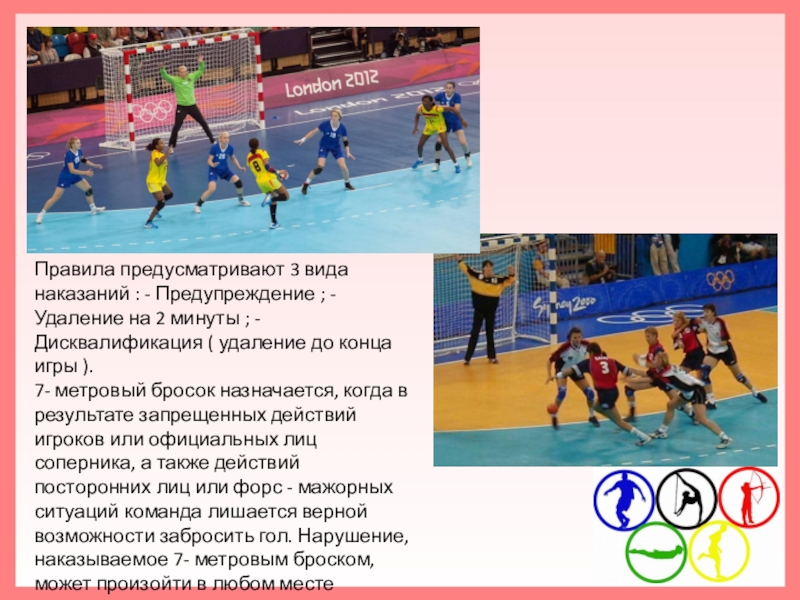 7- метровый бросок назначается, когда в результате запрещенных действий игроков или официальных лиц соперника, а также действий посторонних лиц или форс - мажорных ситуаций команда лишается верной возможности забросить гол. Нарушение, наказываемое 7- метровым броском, может произойти в любом месте площадки.