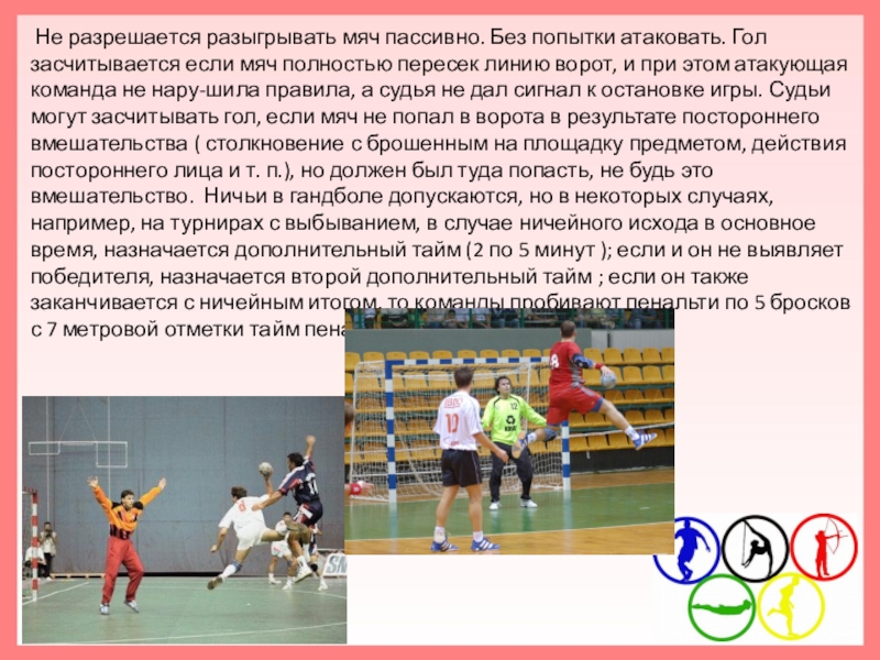 мяч полностью пересек линию ворот, и при этом атакующая команда не нару-шила правила, а судья не дал сигнал к остановке игры. Судьи могут засчитывать гол, если мяч не попал в ворота в результате постороннего вмешательства ( столкновение с брошенным на площадку предметом, действия постороннего лица и т. п.), но должен был туда попасть, не будь это вмешательство. Ничьи в гандболе допускаются, но в некоторых случаях, например, на турнирах с выбыванием, в случае ничейного исхода в основное время, назначается дополнительный тайм (2 по 5 минут ); если и он не выявляет победителя, назначается второй дополнительный тайм ; если он также заканчивается с ничейным итогом, то команды пробивают пенальти по 5 бросков с 7 метровой отметки тайм пенальти.