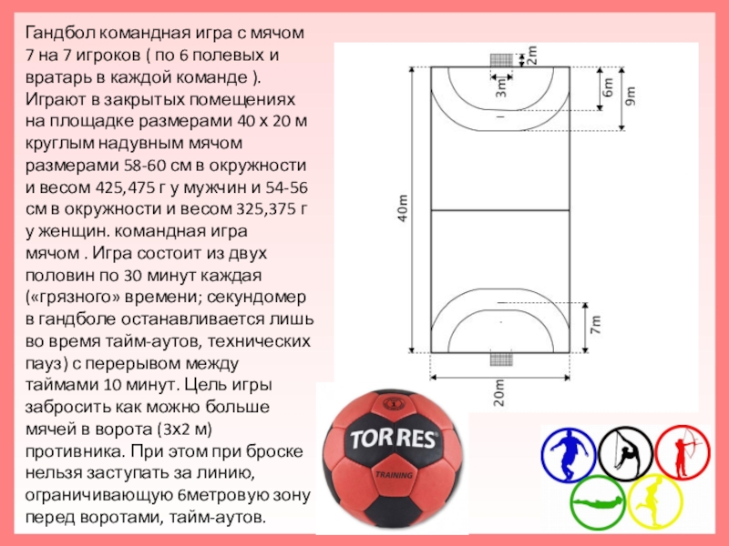 6 полевых и вратарь в каждой команде ). Играют в закрытых помещениях на площадке размерами 40 х 20 м круглым надувным мячом размерами 58-60 см в окружности и весом 425,475 г у мужчин и 54-56 см в окружности и весом 325,375 г у женщин. командная игра мячом . Игра состоит из двух половин по 30 минут каждая («грязного» времени; секундомер в гандболе останавливается лишь во время тайм-аутов, технических пауз) с перерывом между таймами 10 минут. Цель игры забросить как можно больше мячей в ворота (3х2 м) противника. При этом при броске нельзя заступать за линию, ограничивающую 6метровую зону перед воротами, тайм-аутов.
