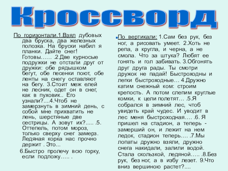 По вертикали: 1.Сам без рук, без ног, а рисовать умеет. 2.Хоть не репа, а кругла, и черна, а не смола. Что за штука? Любят ее гонять и гол забивать. 3.Обгонять друг друга рады. Ты смотри дружок не падай! Быстроходны и легки быстроходные… 4.Дружно катим снежный ком: строим крепость. А потом слепим круглые комки, к цели полетят… .5.Я собрался в зимний лес, чтоб увидеть край чудес. И уводит в лес меня быстроходная…. .6. Я пришел на стадион, а теперь - замерший он, и лежит на нем ледок, стадион теперь…. .7.Мы лопаты дружно взяли, дружно снега накидали, залили водой. Стала скользкой, ледяной….. .8.Без рук, без ног, а в избу лезет. 9.Что вниз вершиною растет?....