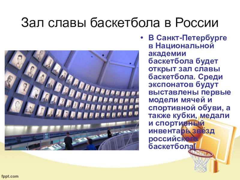 открыт зал славы баскетбола. Среди экспонатов будут выставлены первые модели мячей и спортивной обуви, а также кубки, медали и спортивный инвентарь звёзд российского баскетбола[