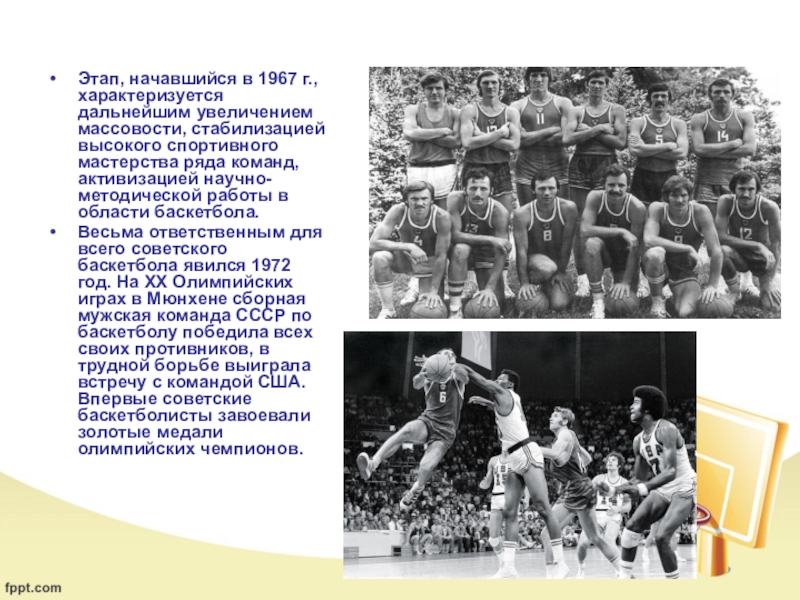Весьма ответственным для всего советского баскетбола явился 1972 год. На XX Олимпийских играх в Мюнхене сборная мужская команда СССР по баскетболу победила всех своих противников, в трудной борьбе выиграла встречу с командой США. Впервые советские баскетболисты завоевали золотые медали олимпийских чемпионов.