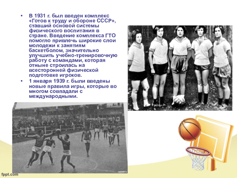 СССР», ставший основой системы физического воспитания в стране. Введение комплекса ГТО помогло привлечь широкие слои молодежи к занятиям баскетболом, значительно улучшить учебно-тренировочную работу с командами, которая отныне строилась на всесторонней физической подготовке игроков.