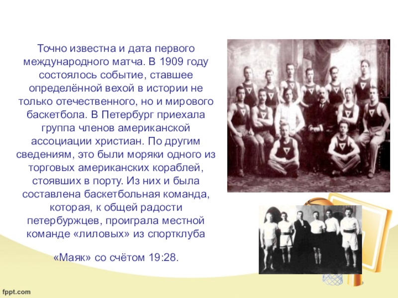 событие, ставшее определённой вехой в истории не только отечественного, но и мирового баскетбола. В Петербург приехала группа членов американской ассоциации христиан. По другим сведениям, это были моряки одного из торговых американских кораблей, стоявших в порту. Из них и была составлена баскетбольная команда, которая, к общей радости петербуржцев, проиграла местной команде «лиловых» из спортклуба «Маяк» со счётом 19:28.