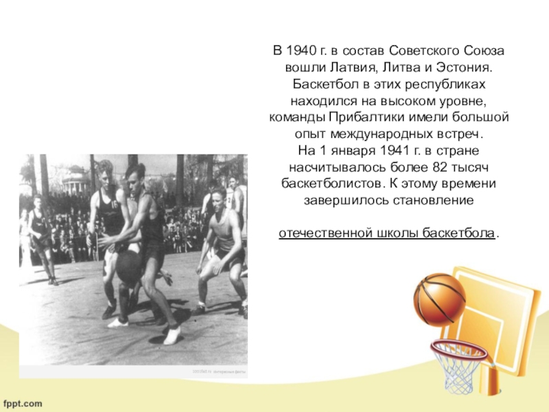 На 1 января 1941 г. в стране насчитывалось более 82 тысяч баскетболистов. К этому времени завершилось становление отечественной школы баскетбола.