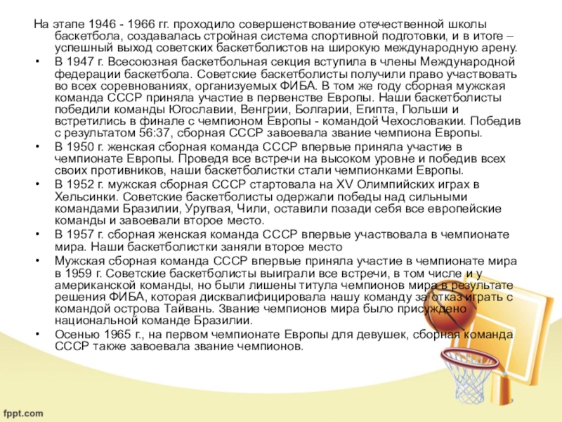 На этапе 1946 - 1966 гг. проходило совершенствование отечественной школы баскетбола,