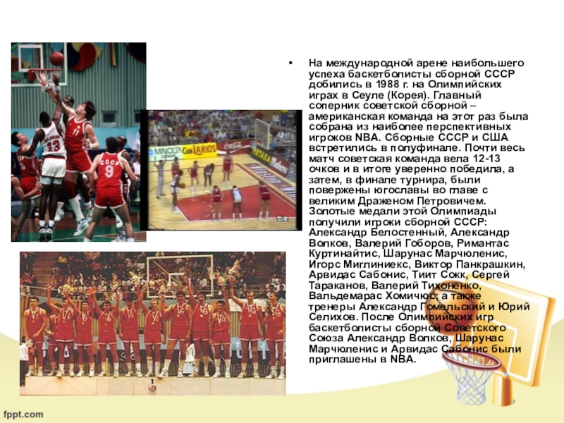 г. на Олимпийских играх в Сеуле (Корея). Главный соперник советской сборной – американская команда на этот раз была собрана из наиболее перспективных игроков NBA. Сборные СССР и США встретились в полуфинале. Почти весь матч советская команда вела 12-13 очков и в итоге уверенно победила, а затем, в финале турнира, были повержены югославы во главе с великим Драженом Петровичем. Золотые медали этой Олимпиады получили игроки сборной СССР: Александр Белостенный, Александр Волков, Валерий Гоборов, Римантас Куртинайтис, Шарунас Марчюленис, Игорс Миглиниекс, Виктор Панкрашкин, Арвидас Сабонис, Тиит Сокк, Сергей Тараканов, Валерий Тихоненко, Вальдемарас Хомичюс; а также тренеры Александр Гомельский и Юрий Селихов. После Олимпийских игр баскетболисты сборной Советского Союза Александр Волков, Шарунас Марчюленис и Арвидас Сабонис были приглашены в NBA.