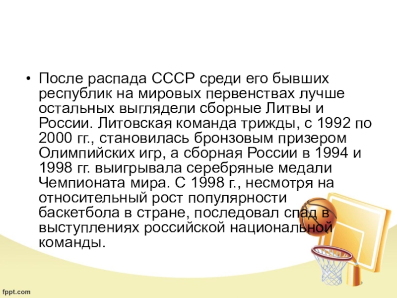 остальных выглядели сборные Литвы и России. Литовская команда трижды, с 1992 по 2000 гг., становилась бронзовым призером Олимпийских игр, а сборная России в 1994 и 1998 гг. выигрывала серебряные медали Чемпионата мира. С 1998 г., несмотря на относительный рост популярности баскетбола в стране, последовал спад в выступлениях российской национальной команды.