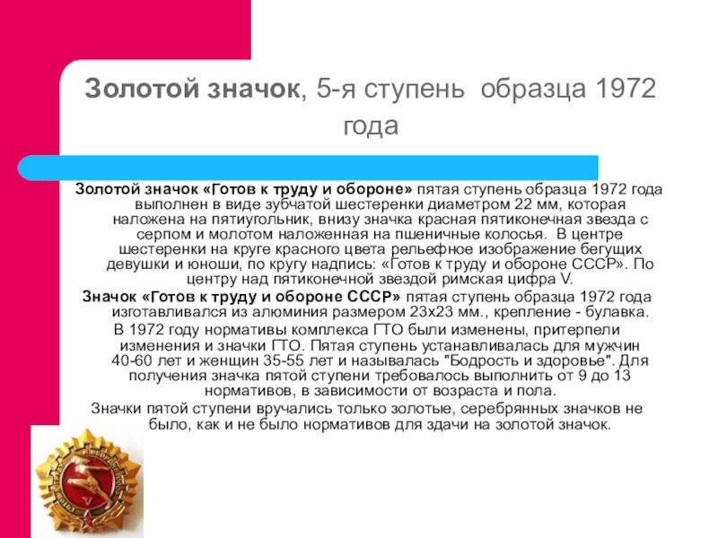 труду и обороне» пятая ступень образца 1972 года выполнен в виде зубчатой шестеренки диаметром 22 мм, которая наложена на пятиугольник, внизу значка красная пятиконечная звезда с серпом и молотом наложенная на пшеничные колосья. В центре шестеренки на круге красного цвета рельефное изображение бегущих девушки и юноши, по кругу надпись: «Готов к труду и обороне СССР». По центру над пятиконечной звездой римская цифра V.