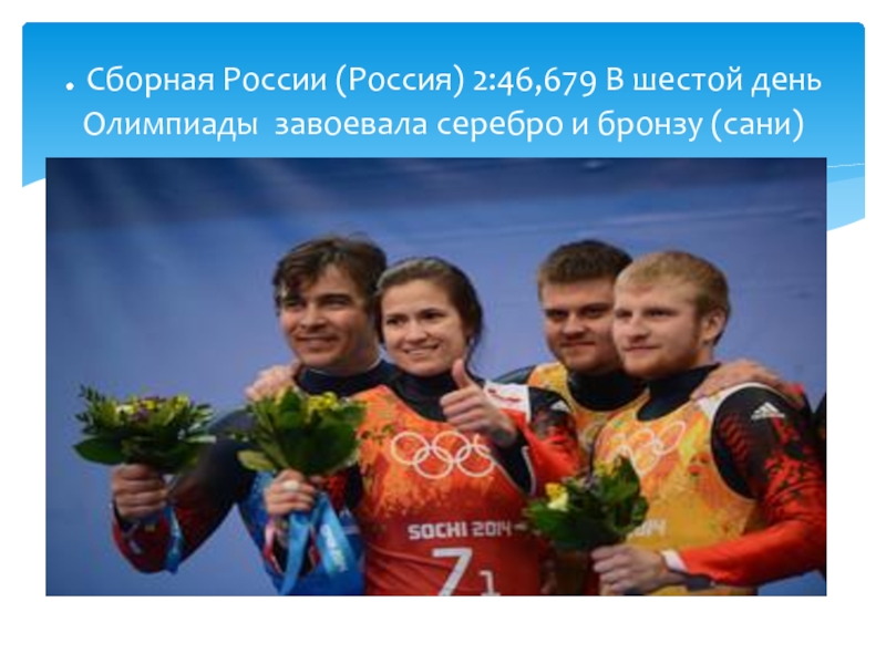 . Сборная России (Россия) 2:46,679 В шестой день Олимпиады завоевала серебро и бронзу (сани)