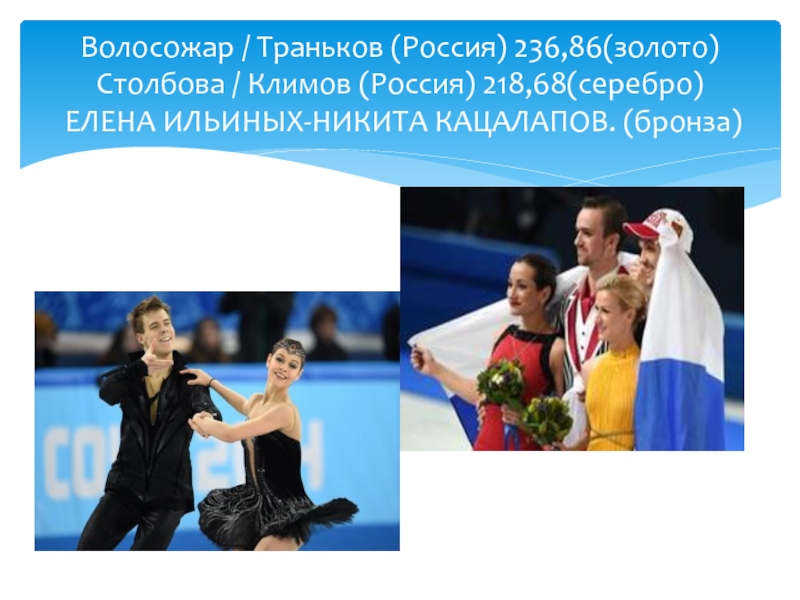 Слайд 21Волосожар / Траньков (Россия) 236,86(золото) Столбова / Климов (Россия) 218,68(серебро) ЕЛЕНА ИЛЬИНЫХ-НИКИТА