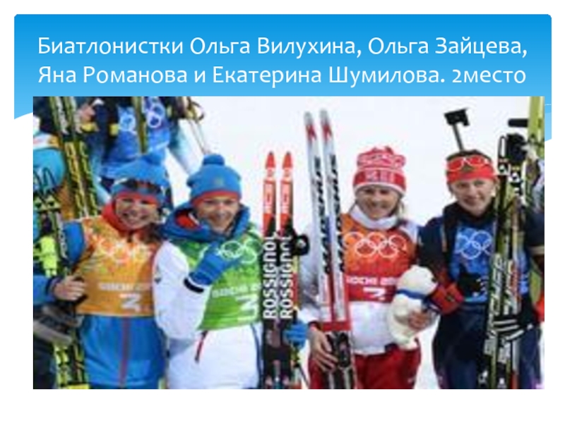 Слайд 10Биатлонистки Ольга Вилухина, Ольга Зайцева, Яна Романова и Екатерина Шумилова. 2место
