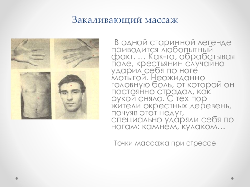 поле, крестьянин случайно ударил себя по ноге мотыгой. Неожиданно головную боль, от которой он постоянно страдал, как рукой сняло. С тех пор жители окрестных деревень, почуяв этот недуг, специально ударяли себя по ногам: камнем, кулаком…