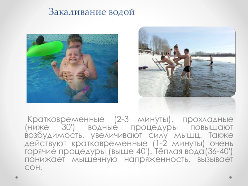 увеличивают силу мышц. Также действуют кратковременные (1-2 минуты) очень горячие процедуры (выше 40'). Тёплая вода(36-40') понижает мышечную напряженность, вызывает сон.