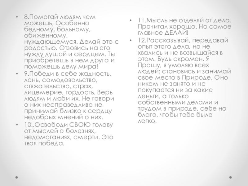 9.Победи в себе жадность, лень, самодовольство, стяжательство, страх, лицемерие, гордость. Верь людям и люби их. Не говори о них несправедливо не принимай близко к сердцу недобрых мнений о них.