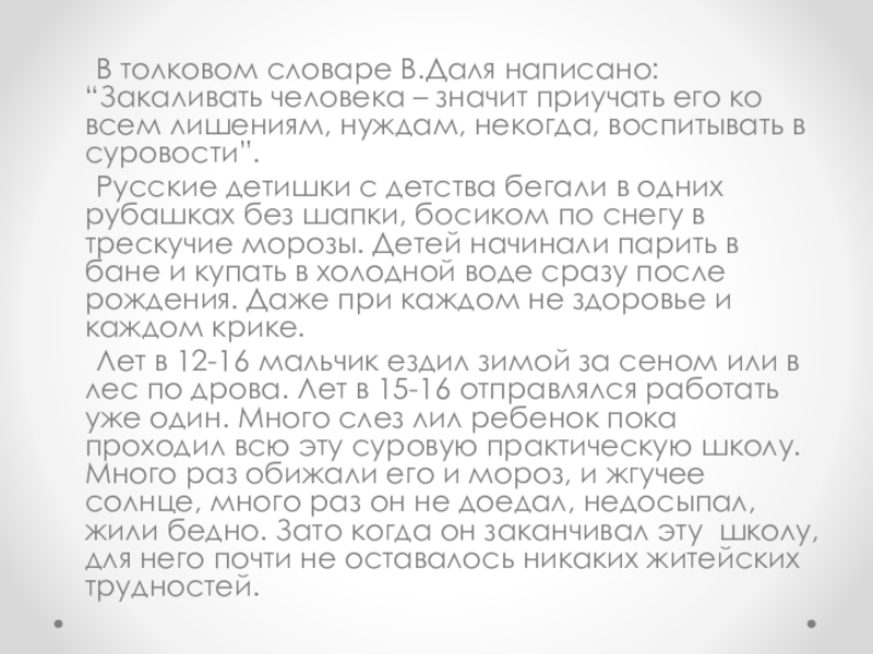Слайд 5 В толковом словаре В.Даля написано: “Закаливать человека – значит приучать его