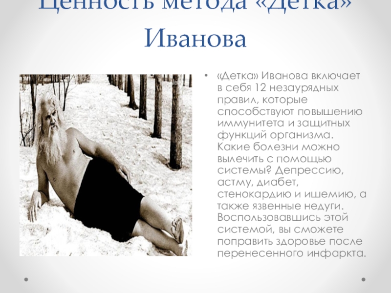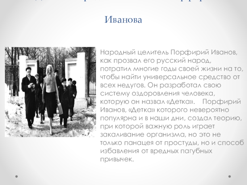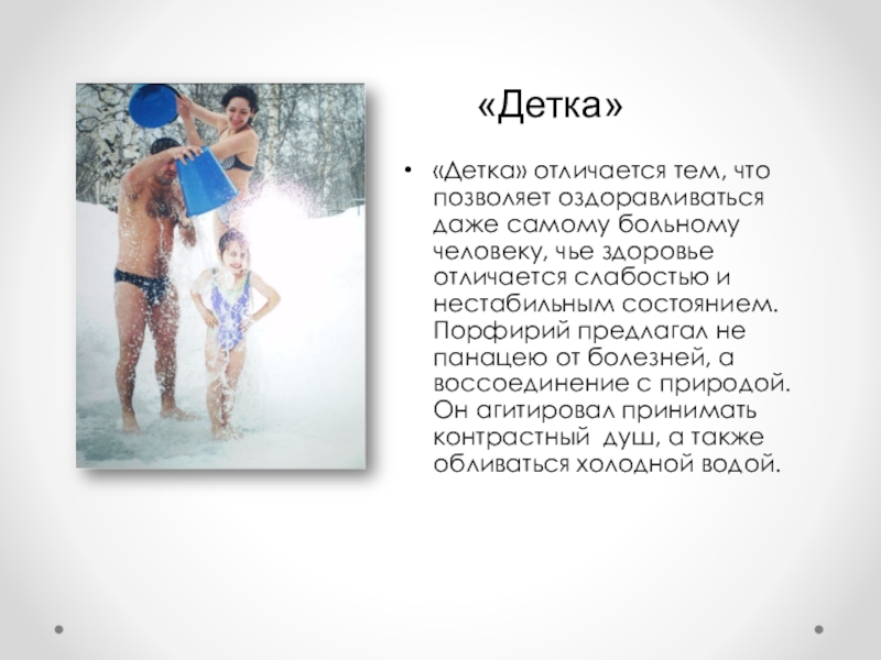 русский народ, потратил многие годы своей жизни на то, чтобы найти универсальное средство от всех недугов. Он разработал свою систему оздоровления человека, которую он назвал «Детка». Порфирий Иванов, «Детка» которого невероятно популярна и в наши дни, создал теорию, при которой важную роль играет закаливание организма, но это не только панацея от простуды, но и способ избавления от вредных пагубных привычек.