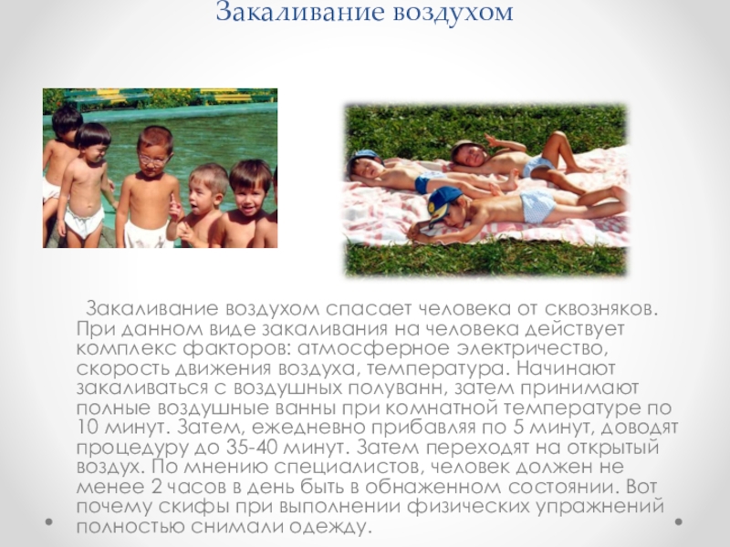 на человека действует комплекс факторов: атмосферное электричество, скорость движения воздуха, температура. Начинают закаливаться с воздушных полуванн, затем принимают полные воздушные ванны при комнатной температуре по 10 минут. Затем, ежедневно прибавляя по 5 минут, доводят процедуру до 35-40 минут. Затем переходят на открытый воздух. По мнению специалистов, человек должен не менее 2 часов в день быть в обнаженном состоянии. Вот почему скифы при выполнении физических упражнений полностью снимали одежду.