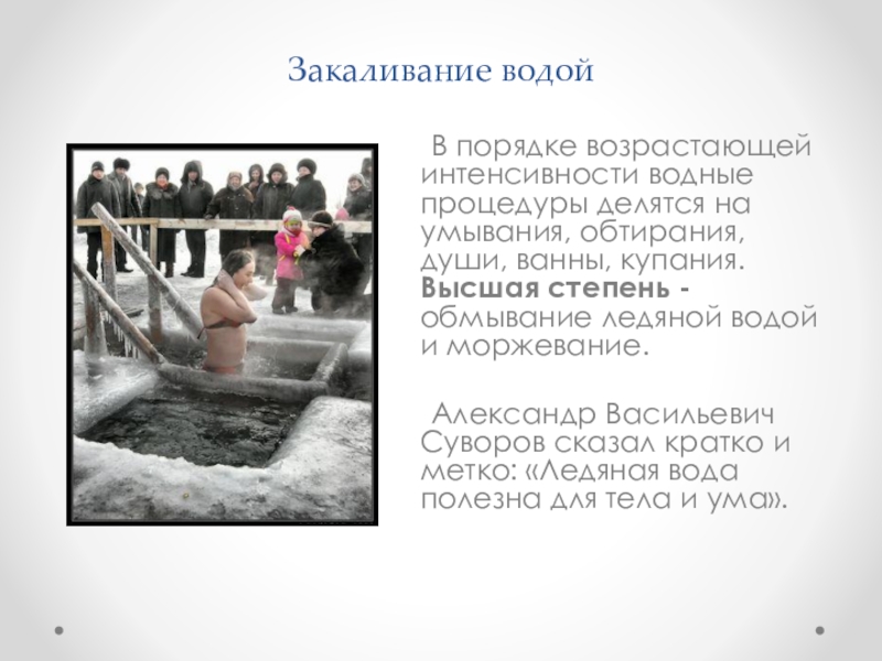 Александр Васильевич Суворов сказал кратко и метко: «Ледяная вода полезна для тела и ума».