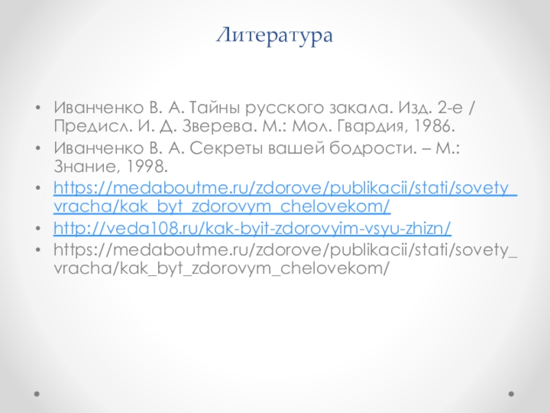 Иванченко В. А. Секреты вашей бодрости. – М.: Знание, 1998.