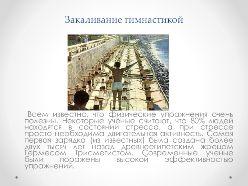 что 80% людей находятся в состоянии стресса, а при стрессе просто необходима двигательная активность. Самая первая зарядка (из известных) была создана более двух тысяч лет назад древнеегипетским жрецом Гермесом Трисмегистом. Современные ученые были поражены высокой эффективностью упражнений.