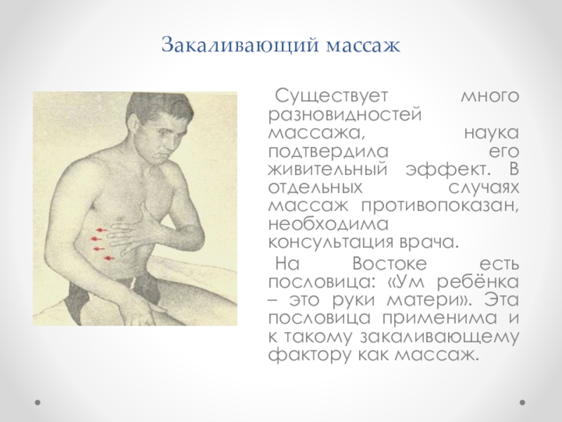 На Востоке есть пословица: «Ум ребёнка – это руки матери». Эта пословица применима и к такому закаливающему фактору как массаж.