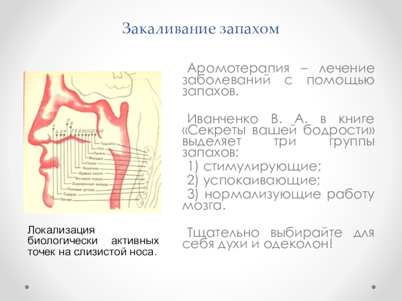 книге «Секреты вашей бодрости» выделяет три группы запахов:
