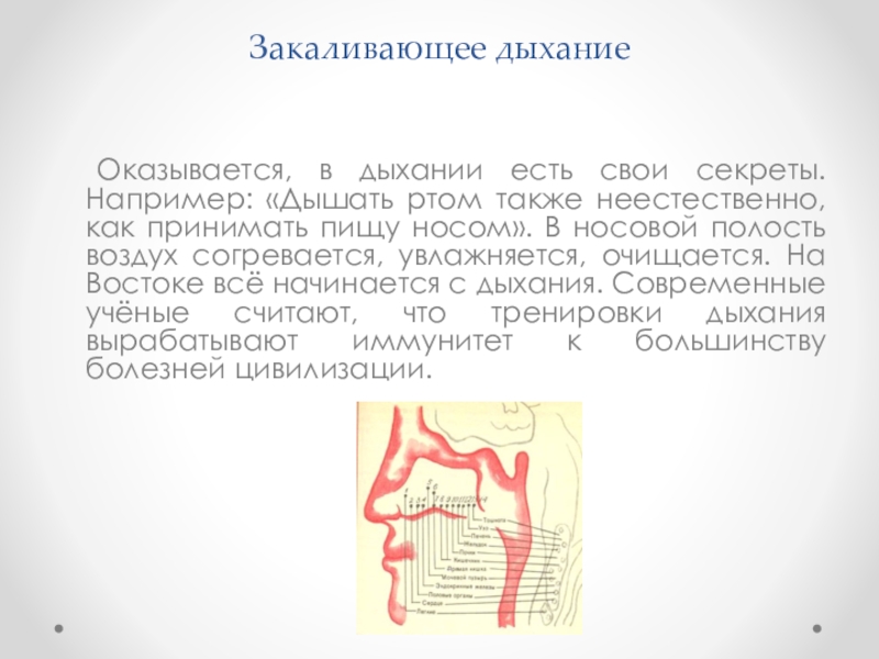 неестественно, как принимать пищу носом». В носовой полость воздух согревается, увлажняется, очищается. На Востоке всё начинается с дыхания. Современные учёные считают, что тренировки дыхания вырабатывают иммунитет к большинству болезней цивилизации.