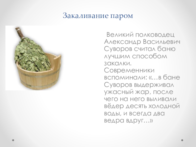Современники вспоминали: «…в бане Суворов выдерживал ужасный жар, после чего на него выливали вёдер десять холодной воды, и всегда два ведра вдруг…»