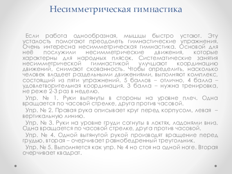 гимнастические упражнения. Очень интересна несимметрическая гимнастика. Основой для неё послужили несимметрические движения, которые характерны для народных плясок. Систематические занятия несимметрической гимнастикой улучшают координацию движений, снимают скованность. Чтобы определить, насколько человек владеет раздельными движениями, выполняют комплекс, состоящий из пяти упражнений. 5 баллов – отлично, 4 балла – удовлетворительная координация. 3 балла – нужна тренировка, не реже 2-3 раз в неделю.
