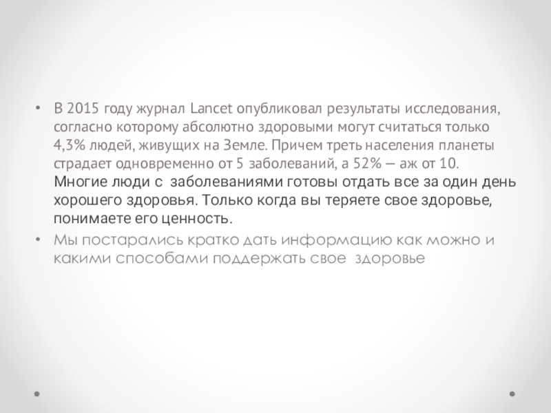 здоровыми могут считаться только 4,3% людей, живущих на Земле. Причем треть населения планеты страдает одновременно от 5 заболеваний, а 52% — аж от 10.