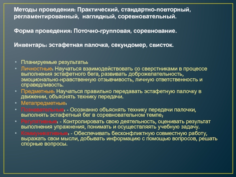 Задачи урока: Образовательные: Учить технике передачи эстафетной палочки в быстром беге.